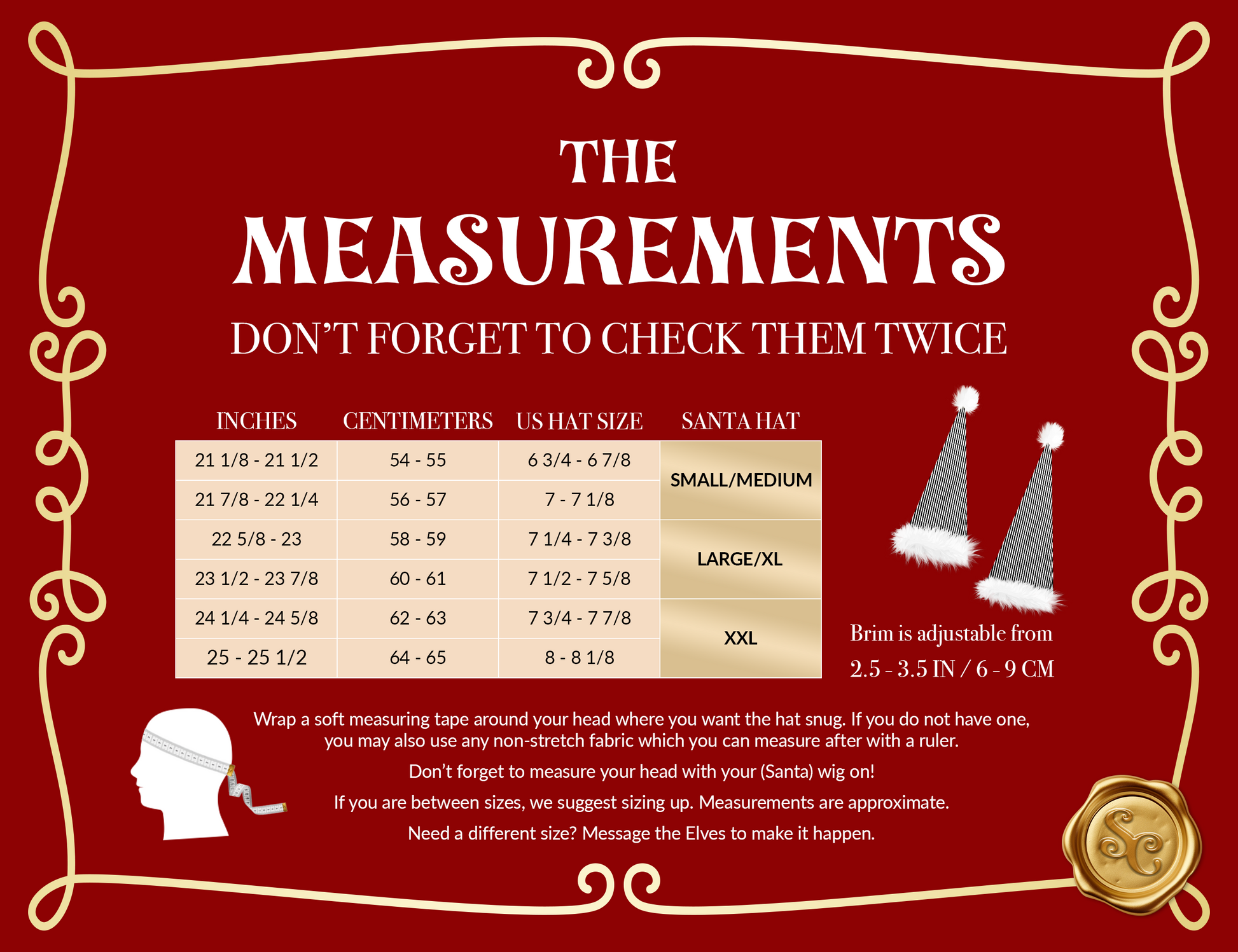 These hats are made for Santaβs of all shapes & sizes (we donβt judge you for eating all those cookies) so weβve made a variety of sizes to pair. That means our hats will also fit when you have a wig on, or need extra space to fit over dreadlocks, afros, big curls, etc.